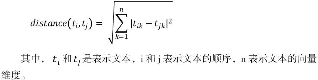 K-mean聚类算法具体过程如下:随机选择K个点作为初始聚类中心,将剩余的每个点按照距离分配给上述K个点,形成K个类簇。然后计算每个类簇的质心,并将其作为下一次迭代的聚类中心,直到满足停止训练的条件[4](例如函数收敛或达到最大迭代次数)。两点之间的距离计算方式有欧几里得距离、余弦距离、曼哈顿距离、切比雪夫距离、Jaccard相似系数等,本文采用欧几里得距离计算方法计算文本与文本之间的相似度。