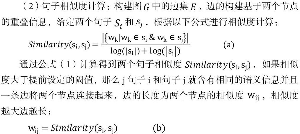 (2)句子相似度计算:构建图中的边集,边的构建基于两个节点的重叠信息,给定两个句子和,根据以下公式进行相似度计算: