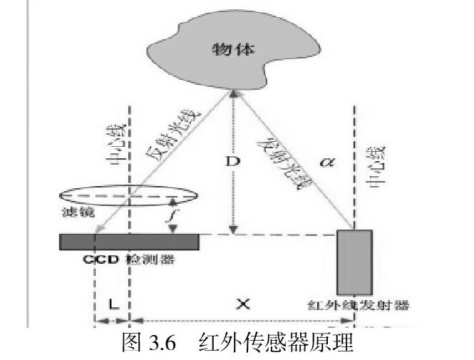 红外传感器利用的是三角测量的方法,把红外传感器按照测量好的角度安装,发射器会以直线发射一束红外光,红外光在遇到物体的遮挡后会反射回去。检测到反射的红外线之后,会有一个偏移的值,形成了三角的关系。通过传感器接收到的返回数据,单片机做出相应的算法处理,知道前方物体的方向和距离等信息。小车会根据得到的信息做出相应的反映和动作。红外传感器原理如图所示。