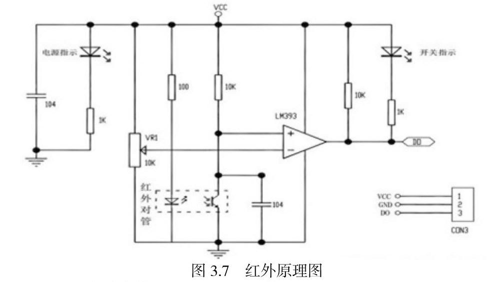红外传感器的限流电阻为10K,红外传输功率由不同性能的限流电阻决定。限流电阻越大,发射功率越小。当光线反射回来并且晶体管导通时,LM393的两个输入端子在同相输入端子中用正表示,在相反相输入端子中用负表示。为了比较这两种电压,将固定电压作为参考电压或阈值电平施加到任何输入端。在另一端施加比较电压。