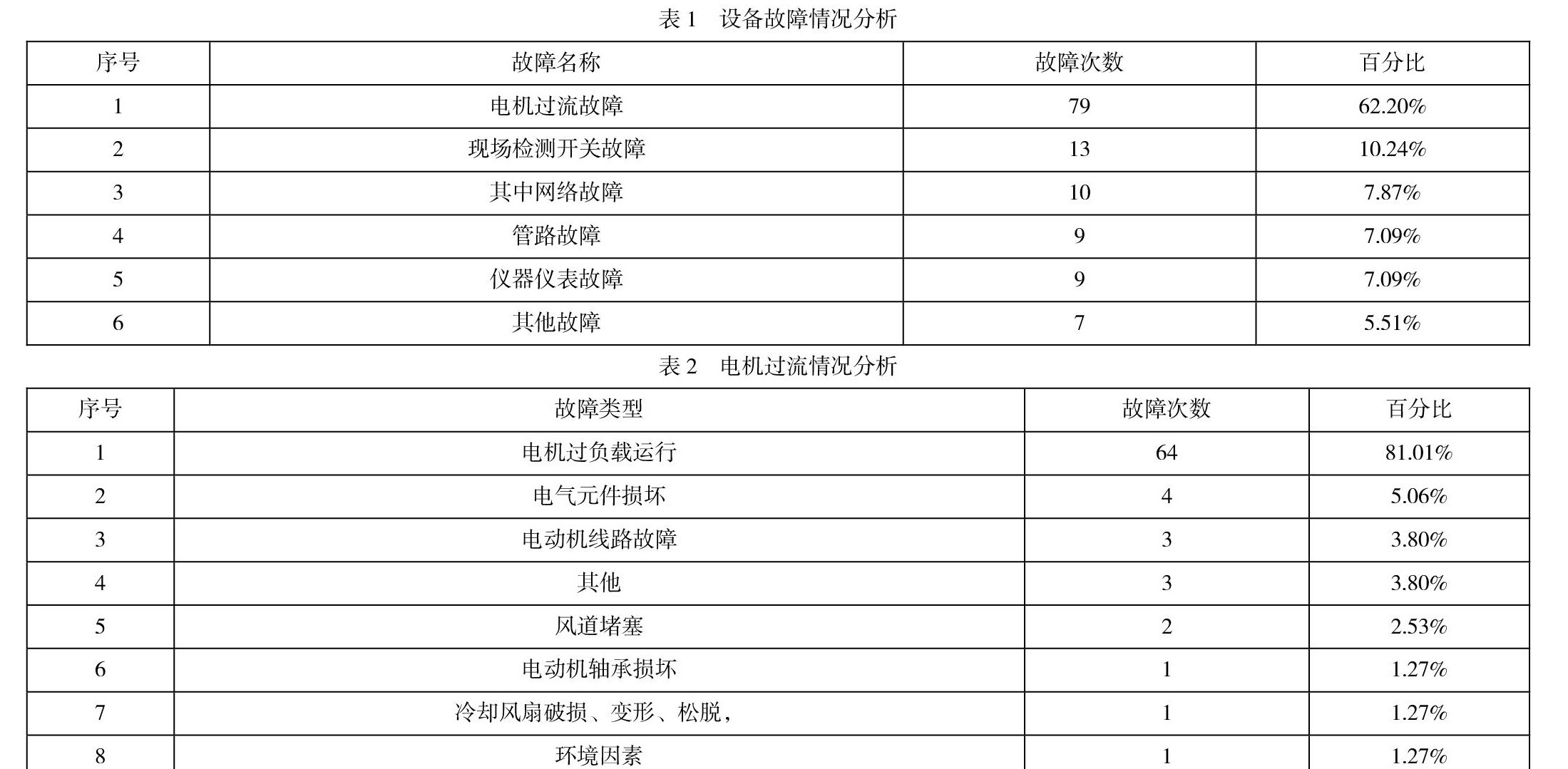 目前某车间在用设备约为400台组,其中包含大型主机设备20台组,通用设备60组以及辅联设备若干,涉及电机600余台。通过对127次设备故障运行情况的数据整理与归类分析,发现其中有62.20%属于电机过流故障(表1),而在电机过流的原因中,有81.01%是因为电机过负载运行产生的故障(表2),也是造成电机过流的最主要原因,严重制约生产的顺利进行。