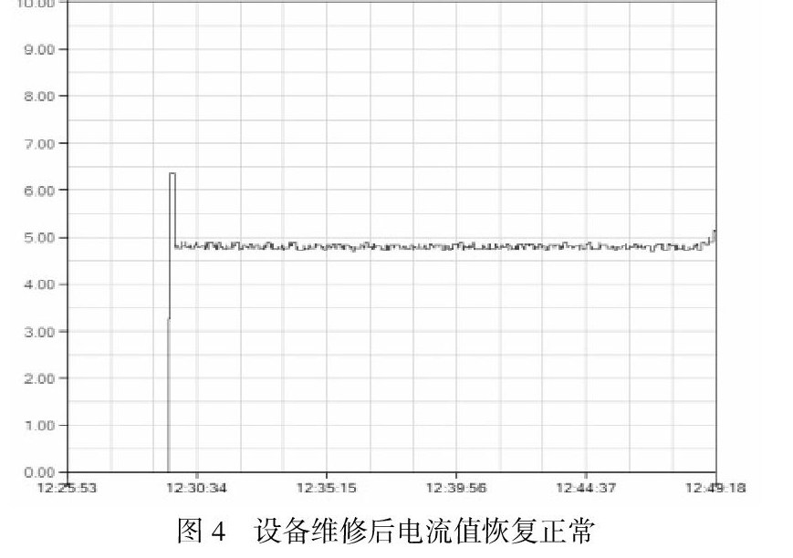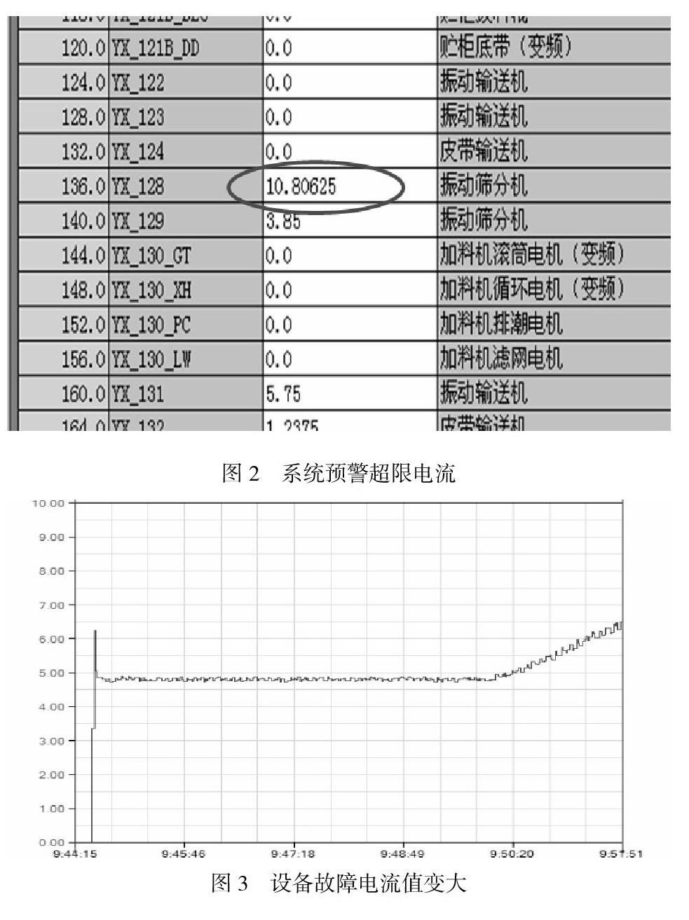 在实际使用过程中时,某线振槽电机在运行时突然出现超过0.8倍的电流值,此时报警模块输出报警信息(见图2),同时上位机趋势图也反映了这一情况(见图3)。修理工进行了全面检查,发现振槽曲轴轴承磨损较严重,更换了轴承后振槽电机电流恢复了正常(见图4)。