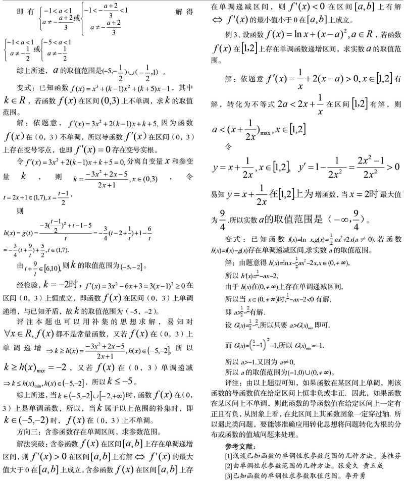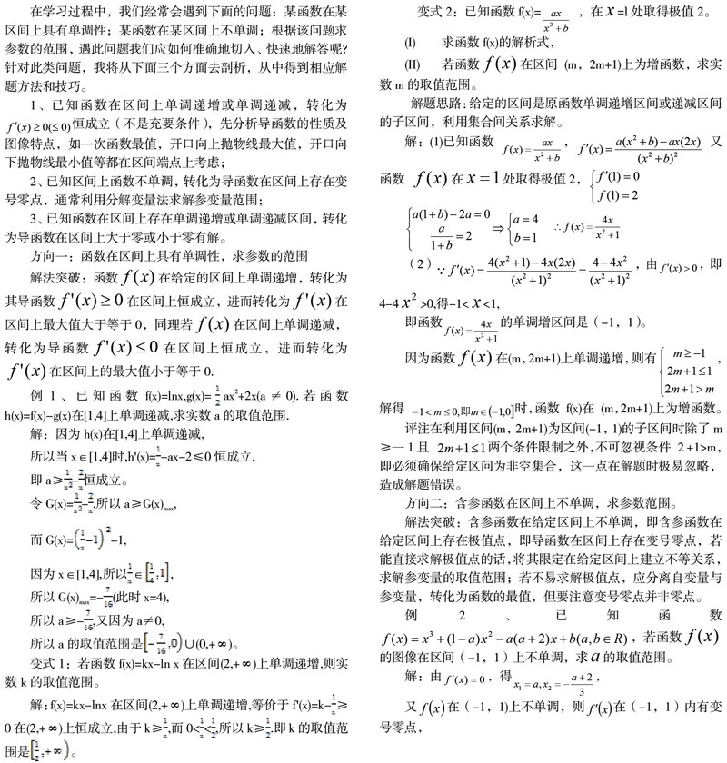 在学习过程中,我们经常会遇到下面的问题:某函数在某区间上具有单调性;某函数在某区间上不单调;根据该问题求参数的范围,遇此问题我们应如何准确地切入、快速地解答呢?针对此类问题,我将从下面三个方面去剖析,从中得到相应解题方法和技巧。
