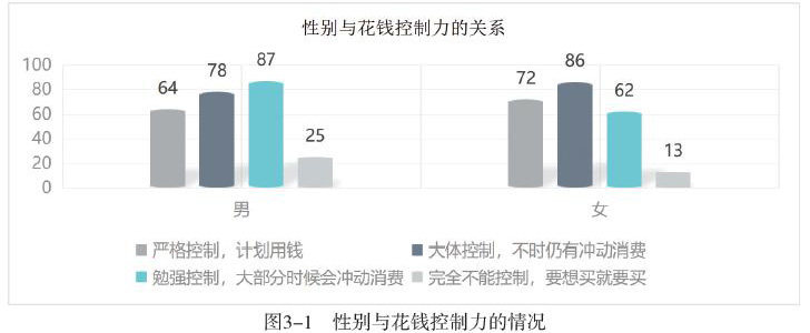 如图3-1,不时仍有冲动消费的比重中,女大学生比例高于男生,分别为36.90%和30.70%。严格控制,计划用钱的方面女生高于男生,比例为25.20%和30.90%。在完全不能控制,要想买就买中男女比例相差不大,为9.84%和5.58%。互联网的崛起,花呗的出现,使得大学生购物的天性被释放。