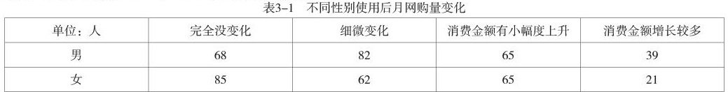 由表3-1看出,男女生对用花呗后月网购量变化是不同的。在完全没变化中,女生比例高于男生,在细微变化中,男生高于女生。消费金额增长较多中,女生都低于男生,这说明女生可以理性的使用花呗,而部分男生就会随着花呗的使用,而增加消费量。