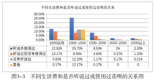 如图3-3,从不同生活费与是否听说或使用过花呗关系的交叉表中可以看出,在听说过并使用过花呗的人群中,生活费为1000-1500区间的人的频率最多,比例为25.7%。