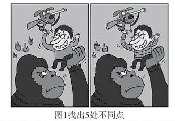 一节课的课堂导入是教师在开展新的教学内容或活动前,引导学生进入学习的行为方式。有趣的导入是课堂教学成功的一半。蓍名教育家苏霍姆林斯基曾说:“如果教师不想办法使学生产生情绪高昂和智力振奋的內心状态,就急于传授知识,不动感情的脑力劳动就会带来疲劳。没有欢欣鼓舞的心情,没有学习兴趣,学习也就成了负担。”好的导入使课堂气氛变得轻松活跃,不仅能吸引学生的注意力,还促使学生的好奇心和求知欲的产生,从而激活学生的思维,提高学习效率。例如:在“眼与视觉”一节教学时,笔者为了导出这节课的课题,设计了一个“找茬”的小游戏,如下图所示: