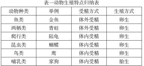 根据表格学生很快可以总结归纳出:除了鱼类和两栖类是体外受精以外,其他类动物大多都是体内受精的方式;除了哺乳类动物几乎都是胎生以外,其他动物一般都是卵生的生殖方式。