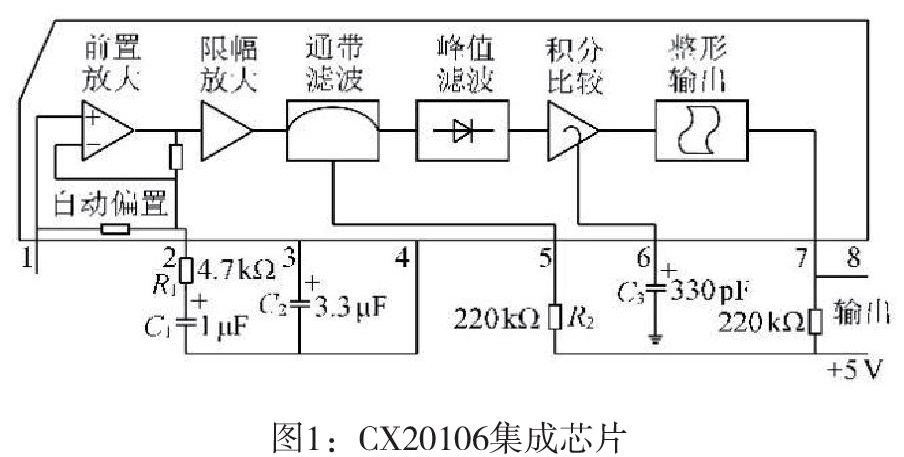 本文的水声modem收听的模块采取非相干解调的功能CX20106集成芯片,CX20106芯片的内部结构如图所示,总开关引脚在外部接入的引脚所决定,当芯片检测到信号后,在其内部的元件会将信号原信号还原,在通过其他元件进行进一步的处理,从而实现通信。