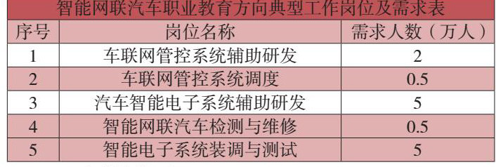 面向近年来智能网联汽车技术与产业发展需要,一些高职院校2011年就开始布局智能网联汽车方向的技术技能人才的培养。据中汽中心数据资源中心分析,智能网联汽车职业教育方向典型工作岗位及需求如下表所示。