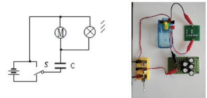 例如,观察电容器充电放电现象实验,器材选用的是灵敏电流计与电容器串联,看指针的摆动方向判断电流的方向。观察到的现象是灵敏电流计指针向一个方向偏转后立刻又回返另一侧,来回摆动几次停在正中,学生会误认为电流是来回振荡的。演示用的灵敏电流计比较重,搬运比较麻烦。所以对原装置进行改进,使用了5个电容并联进行扩容,增加了充电的时间。将单刀双掷开关拨到下方给电容器充电,学生电源输出直流2V,电容器与小电动机相串联,充电时叶片顺时针转动,还有一组二极管与电动机并联,同时发光。将开关回拨到上方,二极管放电叶片逆时针转动。将与二极管相连的线反接,则充电时二极管不亮,放电时,二极管发光。经过改进的仪器,无论是充电还是放电,电流方向只呈现出一个,同时也增加了实验的趣味性。