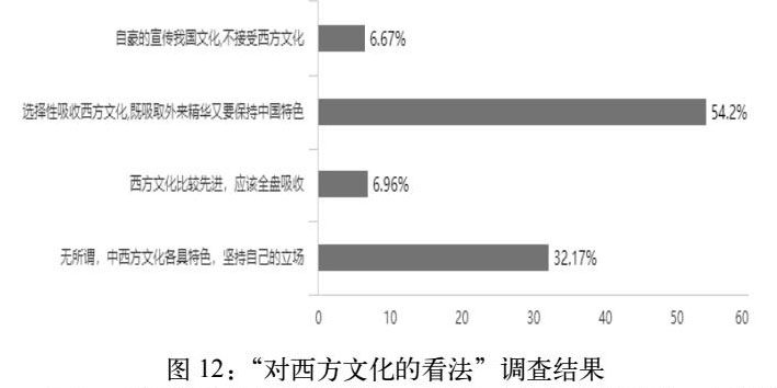 根据问卷数据可以得出,即使大部分大学生认为应“选择性吸收西方文化,既吸取外来精华又要保持中国特色”,但是依然有6.67%的比例认为“自豪的宣传我国文化,不接受西方文化”以及6.67%的比例认为“西方文化比较先进,需要全盘接收”(图12)。这也说明了在对待西方文明这方面,依旧有需要改善的问题。