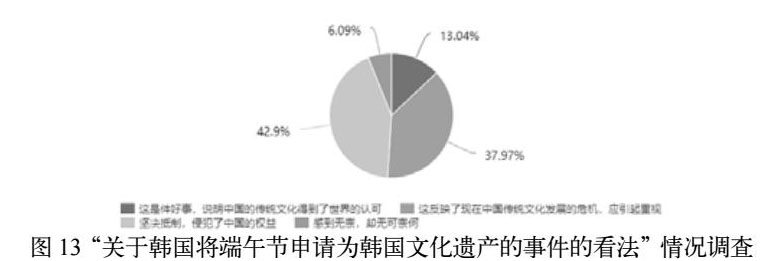 在国家认同感较高的基础上,出现了不能将意识转换为实际学习目标或实际行动的问题。以韩国将端午节申请为韩国文化遗产为例进行设问,据调查结果显示,有42.9%(图13)的被调查者认为对此现象应该“坚决抵制,侵害了中国的权益”,37.93%受访者认为“这反映了现在中国传统文化发展的危机,应引起重视”。这虽然表明了对韩国这种行为的不支持,但是也没有说明其自身没有一个明确的行为意识。