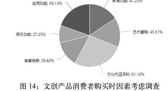 据问卷调查结果显示(图14),绝大部分的文创产品购买者第一项考虑的就是其所蕴含的文化价值,对文创产品的购买不仅仅是为了其实用性,更多的是为了买一种文化和生活方式,是一种由文化带来的情感溢价。