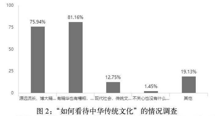 关于传统文化的自信所存在的问题,大致可以分为三个部分:首先是部分大学生对传统文化的不重视,认为其与当今时代发展不符;其次是对传统文化的内容、含义本身不够了解,对其本质把握不清;最后是对文化自信的认同感并不高,因此不能对其进行实践转换,不能做到“外化于行”。