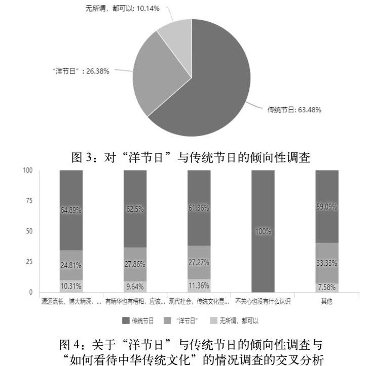 对传统文化的轻视体现在其对传统文化的当今价值认识不清,认为其与当今时代发展要求不符。这种认识大多体现在:其一,对传统思想的不认同,认为其根源于封建等级社会,与当今社会发展不符合;其二,对传统艺术的不认同,在如今互联网信息技术飞速发展的时代,曲艺、绘画、戏曲的受众面与其他现代艺术的受众面对比中处于下风,对传统文化的轻视者认为其过于老旧、艺术表现形式单一。其三,对传统习俗的不认同,尤其表现在对节日的推崇当面,受西方思想的影响,多种“洋节”近年来在中国盛行,据调查数据显示(图3),有63.48%的在“洋节日”与传统节日中选择了前者,而有26.38%的被调查者选择了“洋节日”,同时,认为“现代社会,传统文化显得保守过时了”中选择“洋节日”的占比27.86%(图4),这也充分显示了对传统文化的轻视,从而对传统习俗产生的影响。