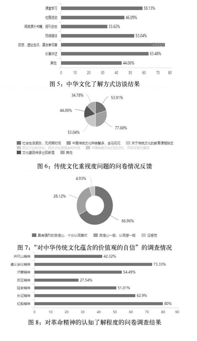 根据调查数据现实,总体上而言,大学生对革命文化的普遍了解程度相对较高,具体体现在对各种革命精神的认知上具有较高水平(图8),对“遵义会议”精神和“红船精神”的认知度高达73.33%及80%。但是根据对部分受访者的访谈来看,仍然存在以下几个方面的问题。