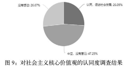 社会主义核心价值观的对于当代大学生具有极重的学习和教育意义。但是据问卷结果显示(图9),对社会主义核心价值观持“认同,会促进社会发展”态度的仅占26.09%,“中立,没有意见的”占47.25%,对其“没有想法的”占26.67%,说明了大部分大学生对社会主义核心价值观没有强烈的认同感,仅仅停留在没有意见的层面。出现这种情况的原因大致可以从以下几个方面进行反思。