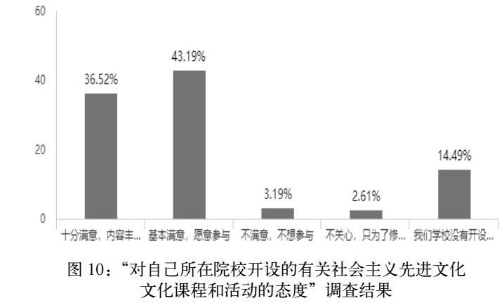 其次,从学校角度上看,根据问卷结果显示,对学校开始有关社会主义先进文化课程或者活动的态度满意程度较高的人数仅占36.52%(图10),充分说明学校教育过程中,有关社会主义先进文化的课程仍待提高。关于这一方面,第一,部分高校对社会主义先进文化教育的重视度不高,甚至出现没有专门的社会主义先进文化课程教育等情况(图10),然而高校作为育人重要环节,对社会主义先进文化教育的缺失必然会对大学生对于此方面的学习和运用产生较大影响;第二,可以从课程内容来看,多强调课堂的形式多样化和丰富化,对课程内容所包含的社会主义先进文化的内涵重视程度不够高,因此就算有较为丰富的课堂形式,也没有很好的将社会主义先进文化的内涵传递出去;第三,教育连贯性问题,对社会主义先进文化的教育应该是一个持续性、长期性的问题,不能仅仅依靠高校教育,但是如今中小学中,虽然有开设关于思想品德的课程,但是并不是对社会主义先进文化的系统性教育,过于碎片化,且对此门课程的重视度普遍较低。因此,我们不能将社会主义先进文化教育的任务全部交于高校,而是应该建立一个系统的、持续的教育培养历程。