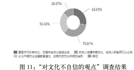 据问卷调查结果显示,大学生的国家认同感普遍较高,但是依然存在某些不合理的观念,例如:盲目学习外来文化,觉得中华文化落后迷信;认为中国文化发展前景堪忧,会被西方文化所侵蚀消失等等(图11)。具体表现可以分为以下几个方面。
