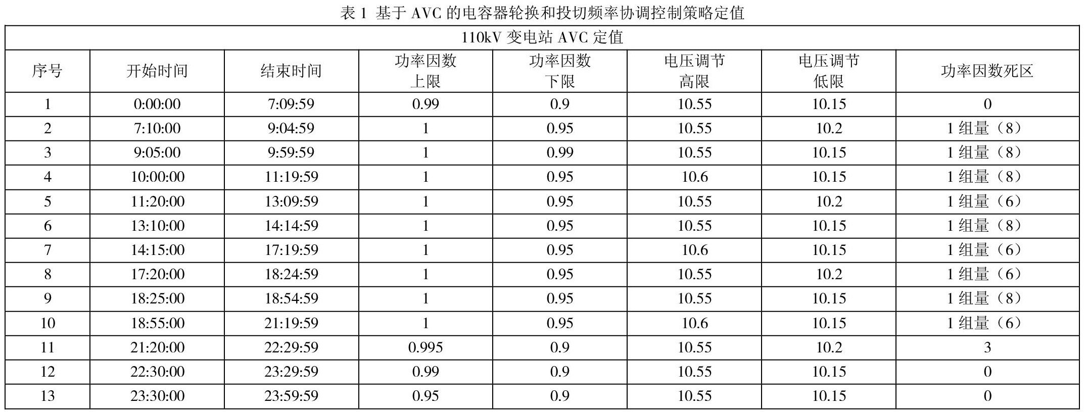 基于AVC的电容器轮换和投切频率协调控制策略定值如表1所示。
