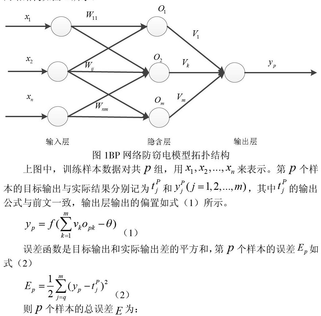 将处理好的用户用电特征数据作为算法模型的输入,结果输出为实际的异常用电结果(异常用电为 1,否则为 0),不断训练 BP 网络,最后将检测数据投放到训练好的算法模型中,用以判断是否有异常用电嫌疑[8]。本文采用以上第二种方式建立防窃电模型。并采用三层 BP 神经网络,神经网络结构如图 1所示。