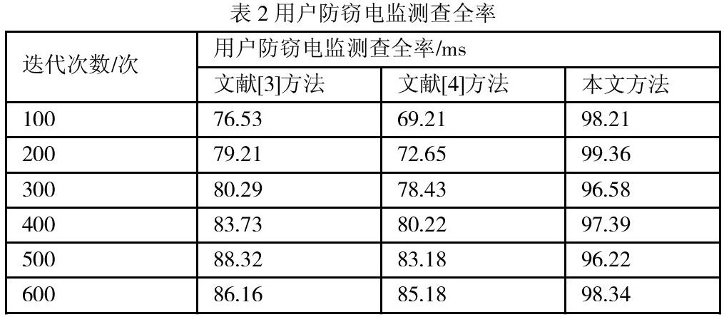 分析表2可知,不同方法下用户防窃电监测查全率存在差异。当迭代次数为100次时,文献[3]方法的用户防窃电监测查全率为76.53%,文献[4]方法的用户防窃电监测查全率为69.21%,本文方法的用户防窃电监测查全率为98.21%;当迭代次数为600次时,文献[3]方法的用户防窃电监测查全率为86.16%,文献[4]方法的用户防窃电监测查全率为85.18%,本文方法的用户防窃电监测查全率为98.34%;本文方法始终具有较高的用户防窃电监测查全率,表明本文方法具有较好的用户防窃电监测效果。