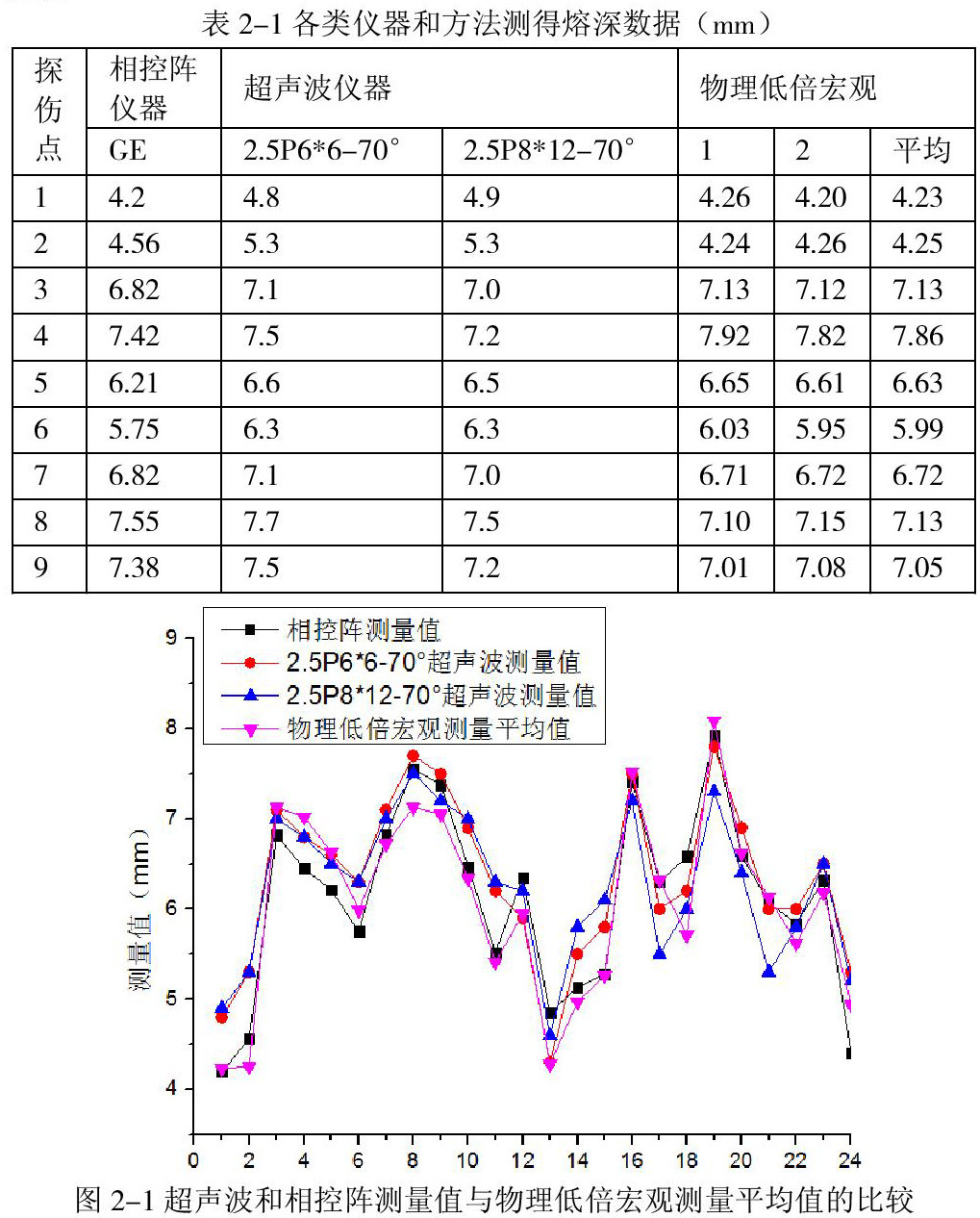 以低倍宏观测量数据平均值为约定真值,超声波和相控阵的试验数据见表2-1。