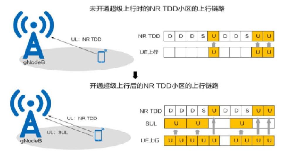 通过超级上行充分利用FDD上行频率资源,将上行数据分时在 FDD和3.5G NR上共同发送,增加了SUL超级上行终端上行可用时频资源,获得上行容量增益,同时由于FDD频率较3.5G NR频率穿损率好,特别在弱覆盖情况下,上行解调性较NR解调性好,变相增加了NR的覆盖,解决了在上行业务带宽需求大的场景和在SA弱覆盖场景下提升了5G网络覆盖和用户感知。