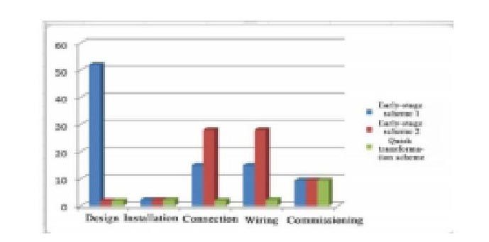 该设计方案采用 "即插即用 "技术,在保护功能、安装尺寸、外部接线等方面完全替代现场保护设备,可实现变电站内二次设备的快速改造。为了验证快速改造方案的可行性和实用性,选择了郑州姚寨110kV变电站作为试点工程。该工程的改造规模为:1条35kV线路、6条10kVⅠ段母线、4条10kVⅡ段母线、1台站用变压器保护、1台电容器保护、1台备用自动切换保护,共14台二次设备。与传统的两种方案相比,以小时为单位的对比图见图10。