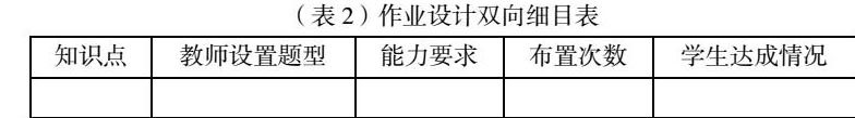 制定作业目标时,除了明确每一份作业的目标内容和认知要求外,还要标记每一个练习对应的目标,同时统计每个知识点出现的频率,使得作业更具有目的性和针对性,减少重复作业。因此,教师们可做作业设计双向细目表(表2):