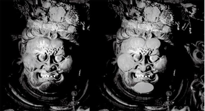 此文字便是基于中国传统雕塑中意象处理形体的造型法则,力求将繁琐的艺术类人体结构解剖课程变得轻松易懂,并将学习者对于人体结构的学习兴趣最大化简洁化。此种意象处理形体的造型法则使得形体的生命力、张力以及维度可以得到最大化,并且形体明确的倾向性更是使学习者甚至是观者易于观察掌握。中国传统雕塑为了将作者自身观念之中的力量最大化而塑造的造型常常是脱离人体生理解剖结构的,如山西高平铁佛寺的这尊造像局部,我们可以明确的观察出此造像的脑门、颧骨、下巴、鼻头、鼻翼、鼻梁的造型处理均为不同大小的类球体(如图片中圈内部分),而眉弓、牙齿的造型处理皆为拉长了的椭球体,因而可以看出,中国传统雕塑中将生理解剖位置上的颧骨、眉弓骨、鼻梁骨等结构转换为简单易懂的或偏圆或偏方或偏尖的类球体几何体,这样的形体处理,首先类球体的满涨体量一定比真实的人体生理结构饱满的多,其次所有的满涨形体按照真人的生理结构位置堆砌起来后,整体的饱满度与视觉冲击力是真是人体所不能及的。因此中国传统雕塑对于形体的塑造呈现效果既将结构形体简明扼要的展示给观众,对于现在的学院雕塑教育领域来说还提供了一种全新的由外而内又简入繁的相较于西方雕塑人体解剖课程由骨骼到肌肉再到表面、由内而外、由繁入简的认识形体的方法。