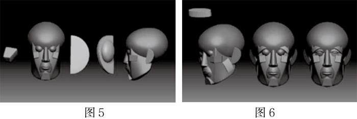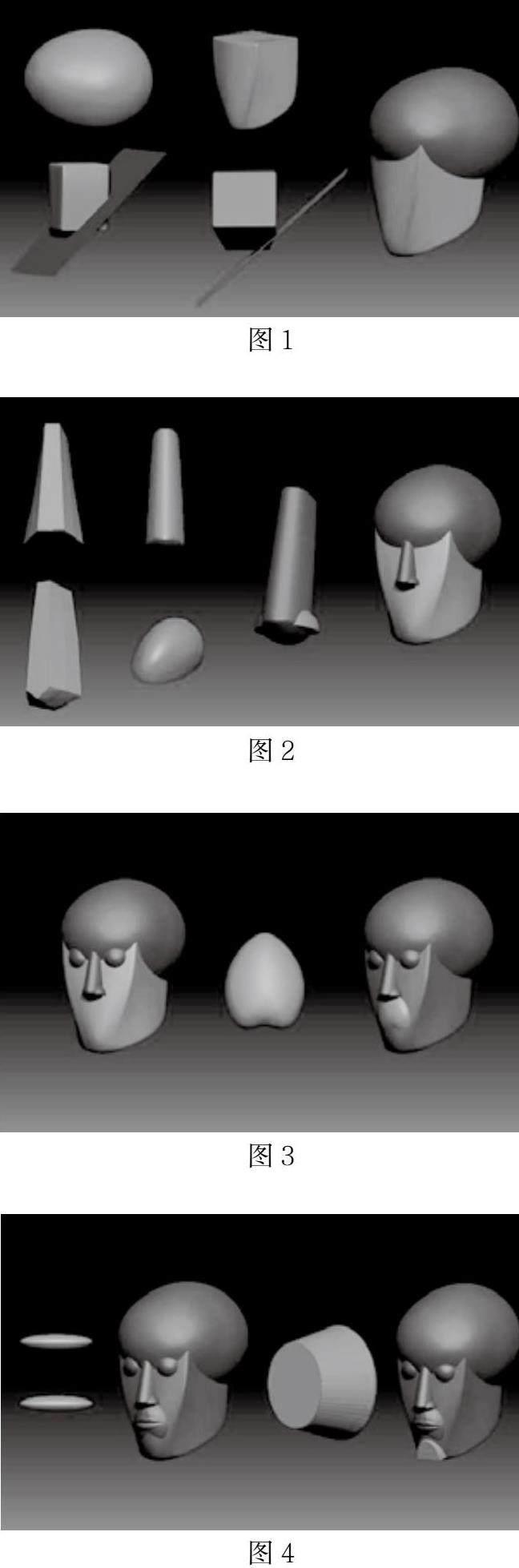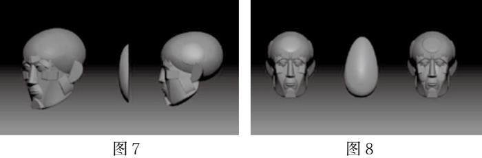 因而以头部结构为例并以中国传统雕塑的意象处理法则由简入繁的将头部解剖结构进行尝试讲解,首先头部主要分为颅骨和面骨两大部分,颅骨为一个横放着的鸡蛋,面骨为一个经过规律切割的两个梯形体的拼接体,如图1所示。再将此梯形体面骨与蛋形体颅骨如图拼接到一起,整个头部大的基本体便已经完成。鼻子的形体首先是一个正侧面为直角梯形,仰视图与俯视图为等腰梯形的一个梯形体,然后在此梯形体的正侧面中间加上一条线,并将其均匀向外拖拽,此处正侧面的两条线为鼻梁处位置,在此形体之上,在此梯形体的底面中间加一条线,并将其均匀向外拖拽,最后在此梯形体之上两个正侧面底端,加上一段微微拉长的两个四分之一球体,整个鼻子的基本体便完成了,并将其放在刚才的头部基本体之上,如图所2示。眼睛则为两个均匀的球体,其直径为鼻子长度的二分之一。下巴为类似与馒头一样的形体,也可以理解为一个一次性水杯,垂直方向从中间均匀切开,并将其水平放到,切开的那一面向下,并插入面骨最下方。口轮匝肌的形体为一个球体,并切下大概六分之一