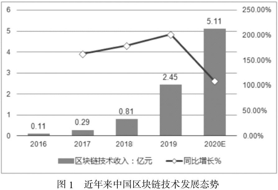 因数字货币被人广泛熟知的区块链技术发展历史悠久,作为社会发展所应运而生的产物,人们逐渐改变对其的原始偏见,利用其所具备的独特优势推动各个领域的蓬勃发展。从2016年起,我国便逐渐开始涉及区块链领域的研究探索,目前正处于技术发展的第二个合约发展阶段。2019年我国区块链技术的收入达到2.45亿的水平(如图1)。通过对2016年到2019年的数据分析,其收入将在2020年达到5.11亿元的发展趋势,具有较大的发展潜力与前景。
