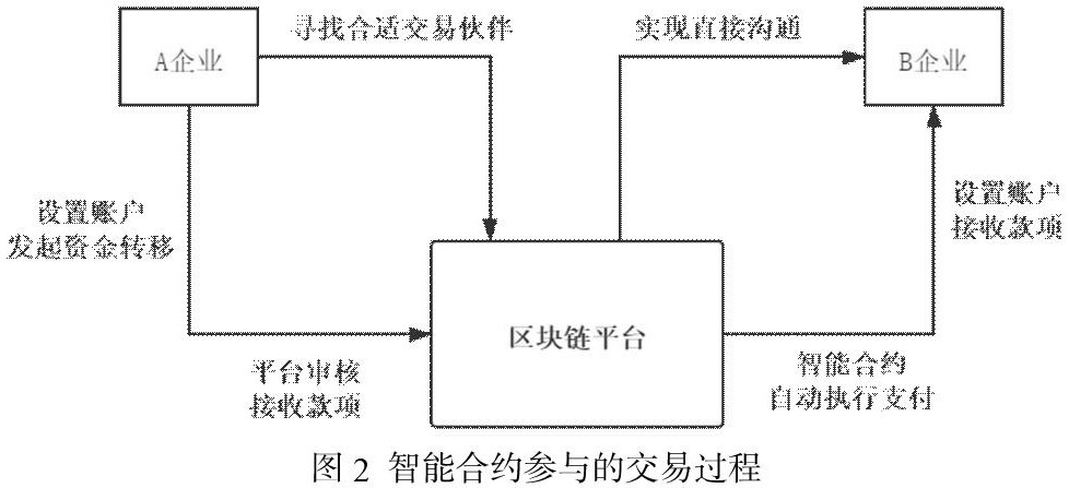 通过区块链技术的智能合约特征创新交易方式。区别于传统模式双方需要在多方中介机构参与下完成交割过程,智能合约通过约定协议,可以去中心化地进行高效率的执行运作,AB双方的资金交易在区块链平台进行点对点直接地对接(如图2)。