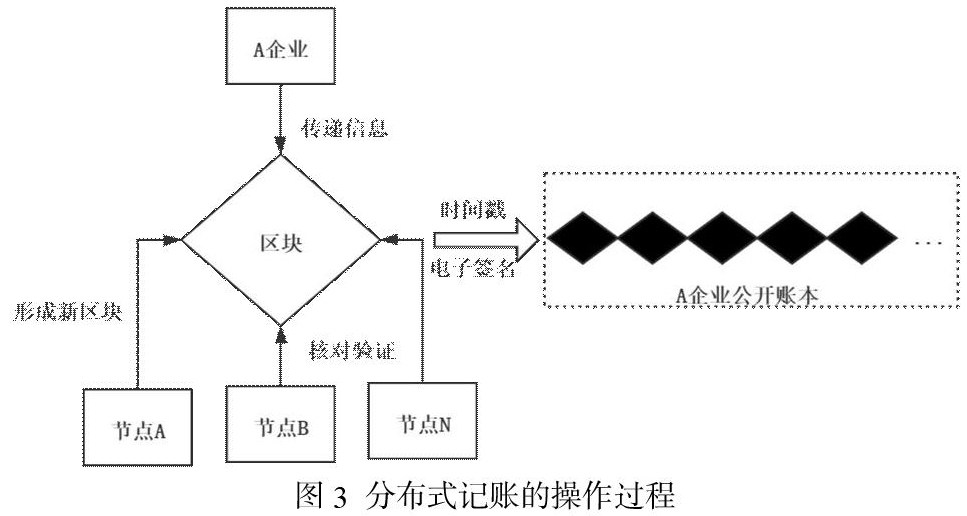 区块链技术将颠覆传统的财务会计记账模式,使得企业在分布式记账过程中实现财务公开透明。当企业A与企业B进行资金或商品交易时,区块链会通过平台将有关信息传递给每个节点,节点会核实制造商产品代码、有关凭证发票,并把有关信号所要求的内容收集一起。此时,所有的节点进行无差别比赛,构建交易验证环节,赋予最先计算核对交易有效的节点拥有该区域的权利。接着该节点向平台宣布该交易的不可更改的时间戳,并签上属于自己独一无二的数据签名。链条上的其他节点检查核对其计算记录的正确性,将新区块实时更新至链条上,形成透明不可更改的记账交易。随着交易活动的不断记录,企业的公开账本将形成一条由不同时间戳和哈希值组成的区块链条(如图3)