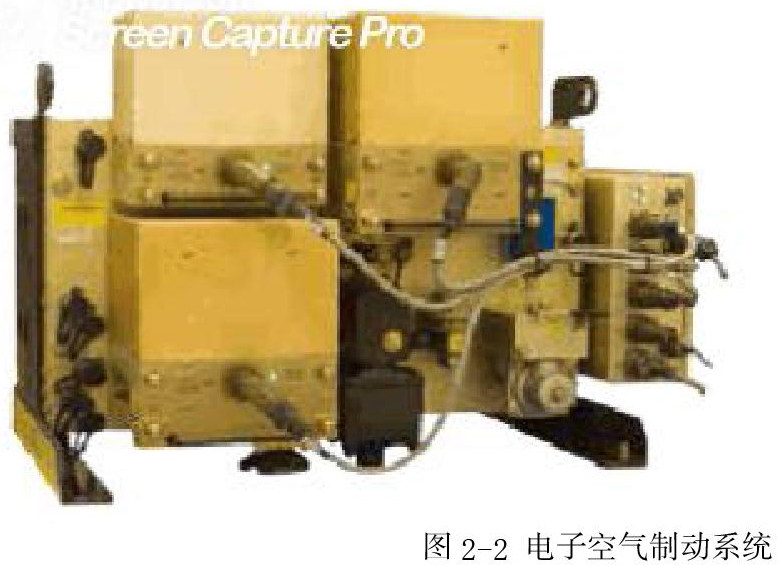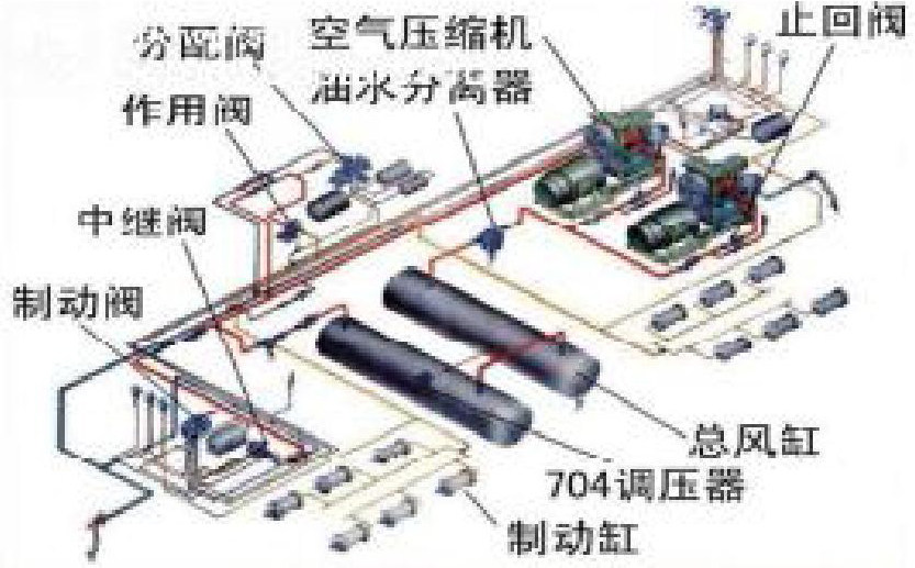 威斯汀豪斯于1869年获得火车的空气制动器专利,并创办威斯汀豪斯空气制动器公司。他的自动空气制动器迅速推广到全美和欧洲[1]。1886年,他创办了西屋电气公司,于1888 年提出相继作用原理并用于紧急制动的设想,发明了带紧急制动局部减压作用的一次缓解快动作三通阀,即H型三通阀。这种紧急制动局部减压作用,即在紧急制动中,每辆车上的三通阀帮助制动管减压一部分,并逐一向下一辆车传递。图2-2为西屋制动的电子空气制动系统,包括列车管控制部、制动缸控制部、缓解控制部、电源部几个部分。