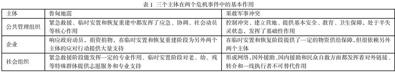三个主体的行动一定是指向可预知、可实现的成果,两个危机事件的性质不同,所以三个主体所发挥的作用也有区别: