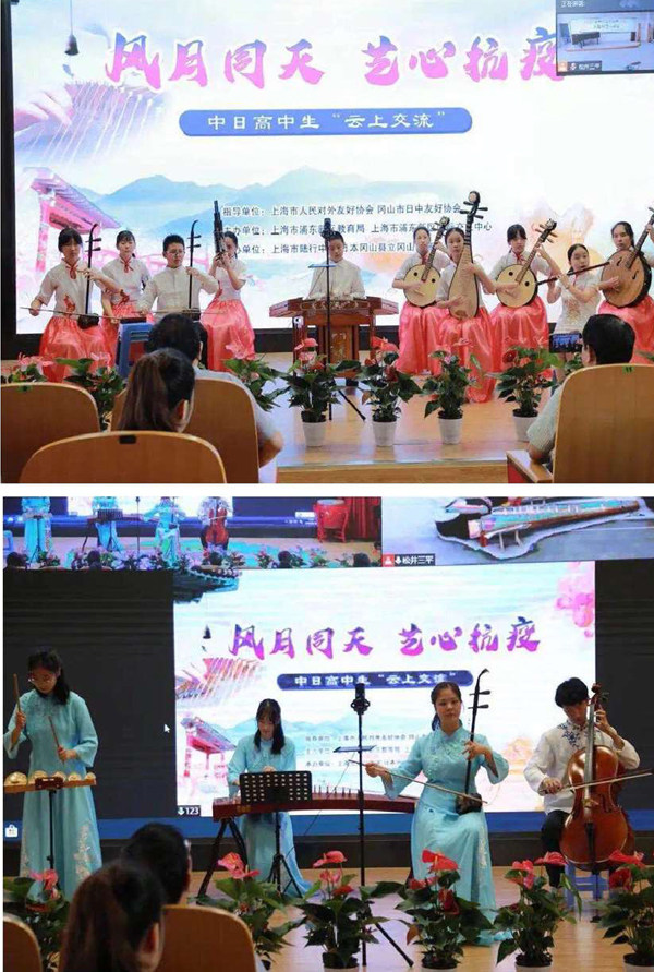 我校的民乐教育对学生,对社会都有很大的影响,也得到很多专家名人的关心和指导。2020年8月18日下午,上海市陆行中学与姐妹学校日本冈山县立冈山南高等学校通过视频在云端相会,进行了“风月同天 艺心抗疫”为主题的高中生云上交流活动。中方代表上海市人民对外友好协会调研员郭盛麟先生在活动上表示,疫情以来,陆行中学和日本冈山南高中互相关怀,相互支持。6月开始,两校的师生加强了线上沟通,通过视频在云端进行交流。本次孩子们的艺术文化交流活动就像是朋友间的互访,通过共同感兴趣的主题,让大家的心越贴越近。 日方代表冈山日中教育交流协议会事务局长大川泰荣女士表示,协会每年开展日中交流活动,至今已有15年。虽然今年两国学生无法实现线下互访,但她很欣慰地看到学生们可以通过互联网,实现“云上交流”,希望通过今天的活动,让两校的交流持续下去,不断加深友谊。