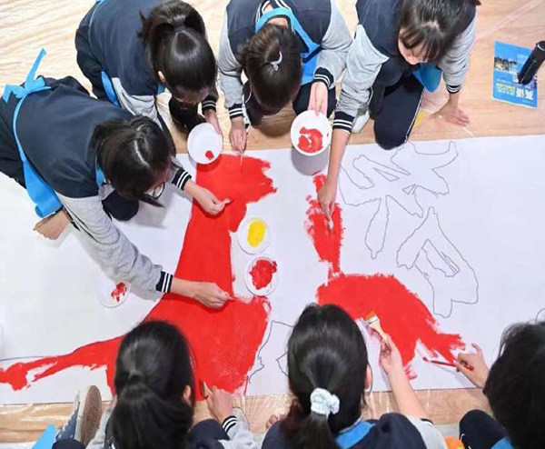 在此基础上,学校探索美术教育的新思路和新方法,不断组织学生参观各类的美术展览,让学生能接近大师,走近艺术的殿堂,让高雅的艺术能不断地走向学生、走向民间,在艺术氛围的熏陶下,培养学生的艺术情操,为学生的全面健康的发展奠定基础。2020年10月19日下午,上海市陆行中学的校园里热火朝天、热闹非凡,全体高二年级学子齐集一堂。在这里,同学们手握画笔尽情创作,用那鲜艳的颜料绘制缤纷的画卷,以此方式来参加到“知四史,守初心,践行动”的活动中去。在此次活动中,高二年级的同学们一个个手执画笔,精心描绘,团结一心,相互协作。尽管蹲在地上不舒服,亦或是颜料弄脏了衣服,同学们都无暇顾及,每位同学都承担起自己的责任,认真描绘、尽情创作自己负责的部分,共同描绘好这美丽的画作。在这短短的90分钟内,经过300多名同学的共同努力,一幅绚烂多彩的图画呈现在同学们的眼前——绵延万里的长城,精致高耸的华表,迎风飘扬的红旗,肆意奔跑的青年,这丰富的画面、绚烂的色彩,无不展现着陆行学子的意气奋发、蓬勃朝气。拍照留念时,同学们口中共同喊出的口号更是对青春的赞美,对未来的期待。