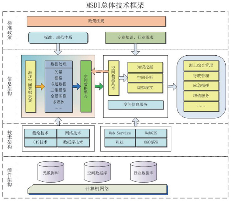 (3)在遵循国家和交通运输部标准的基础上,建立海上空间基础设施(MSDI)数据分类、数据类型等的标准、编制数据字典,构建多源数据的交流、共享的接口及存储机制;