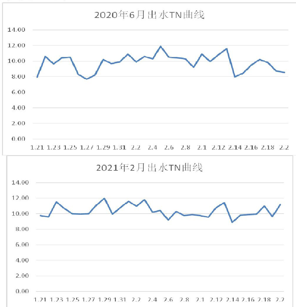 从三年同月幅度来看在水质突变前(2020年7月)某污水厂整体的出水TN波动从2018/2019/2020三年六月的整体波动来看2018年在7.5mg/l至14.7mg/l,波动较大,2019年已经没有超过14mg/l的TN基本控制在8~14mg/l之间,2020年保持在8mg/l至12mg/l效果显著,2021年2月基本在9~12mg/l之间碳源投加更加精细,TN控制稳定性上达到预期目标。