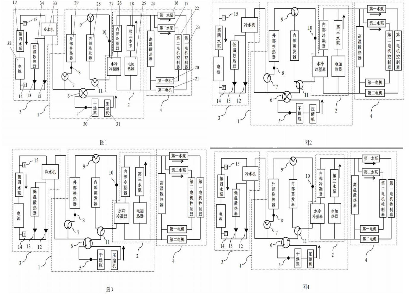 2.7如图1至图4所示,电机电控冷却回路包括与第一驱动电机20和第二驱动电机21连接的高温散热器24、与高温散热器24连接的第一水泵16和第二水泵17、与第一水泵16和第一驱动电机20连接的第一电机控制器22以及与第二水泵17和第二驱动电机21连接的第二电机控制器23。第一水泵16的进水口与高温散热器24的进水口连接,第一水泵16的出水口与第一电机控制器22的进水口连接,第一电机控制器22的出水口与第一驱动电机20的进水口连接,第一驱动电机20的出水口与高温散热器24的进水口连接,第二水泵17的进水口与高温散热器24的进水口连接,第二水泵17的出水口与第一电机控制器22的进水口连接,第二电机控制器23的出水口与第二驱动电机21的进水口连接,第二驱动电机21的出水口与高温散热器24的进水口连接。第一水泵16的进水口和第二水泵17的进水口并与第三水泵18的出水口连接,第一驱动电机20的进水口和第二驱动电机21的进水口并与电加热器25的进水口连接。电动汽车热泵空调系统中增加电加热水循环回路间接地给车辆乘员舱内制热,系统通过冷水机33采集电池冷却回路热量与热泵空调回路交换,辅助热泵系统制热;同时将电机电控冷却回路热水与电加热水循环回路热水连通,辅助电加热水循环系统制热。公布系统通过电控系统,可灵活地适应电动汽车电池、电机电控系统的冷却和车辆乘员舱内空气温度调节的需求。