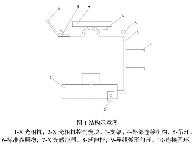 实施例中,一种基于标准参照物的X光拍摄识别导线型号装置,包括支架3,支架3的上端安装有与其固定连接的导线弧形勾环9,支架3的下端安装有与其可拆卸连接的X光相机1;导线弧形勾环9的上端安装有X光感应器7。X光相机1对导线及标准参照物6进行同框拍摄,X光传感器7形成影像确定导线信息,导线弧形勾环9用以挂在导线上固定整体装置。X光传感器7的下端安装有标准参照物6。标准参照物6设置在X光传感器7的前端,并使其于导线平行,且与X光相机1镜头垂直。导线弧形勾环9的上端两侧分别安装有吊环5。具体实施方式,外部连接机构4与外部移动机构连接固定,外部移动机构将装置整体移动到指定位置,将装置整体挂于导线上,导线卡入导线弧形勾环9内,避免装置错位,标准参照物6设置在X光传感器7的前端,并使其与导线平行,且与X光相机1镜头垂直,X光相机1镜头垂直,通过X光相机1对导线和标准参照物6进行同框拍摄,在X光传感器上形成影像,再通过图片测量软件对标准参照物6尺寸和导线相对尺寸进行分析识别确定导线外径和钢芯直径。