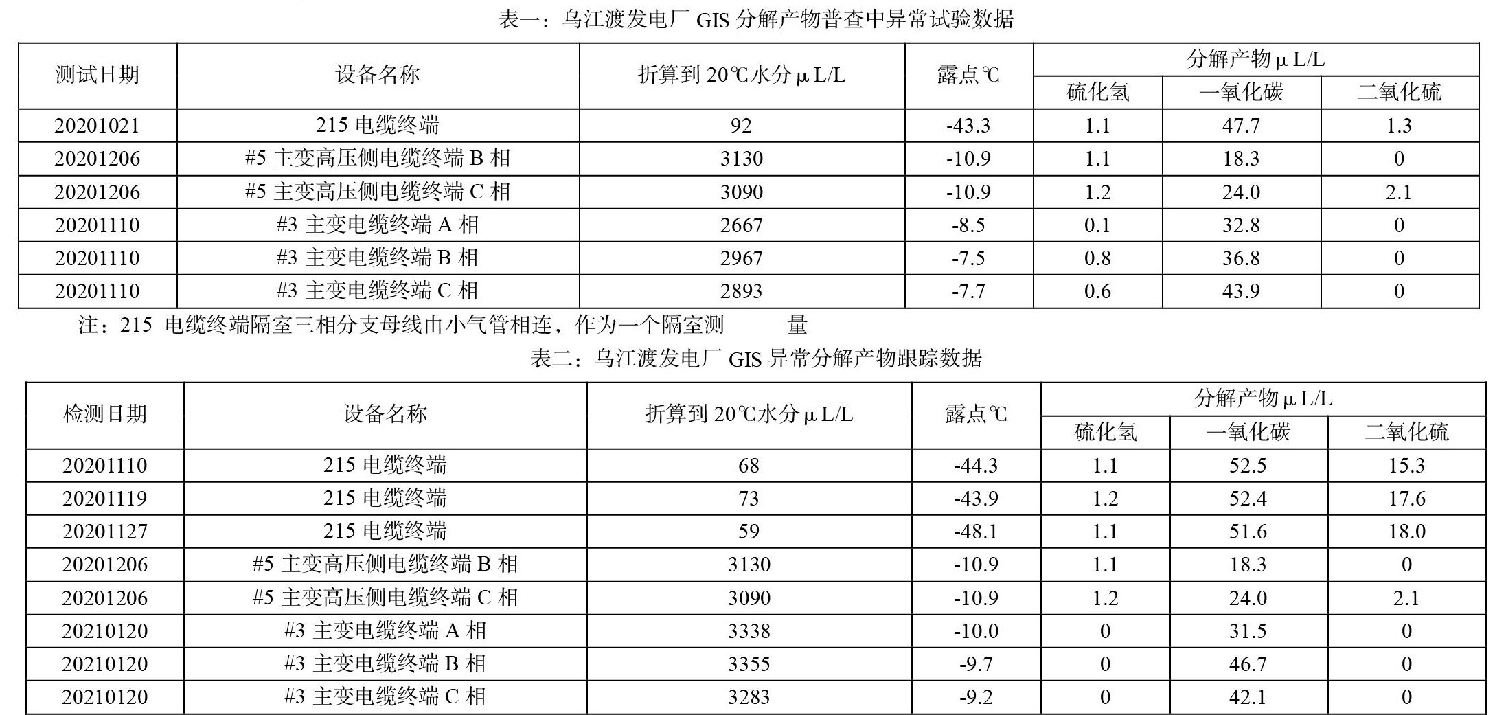 乌江渡发电厂于2020年10月至11月对全厂GIS设备共203个隔室进行分解产物普查。通过普查发现有6个隔室有特征气体SO2和H2S。后进行了数据跟踪。试验结果见表一、表二、表三: