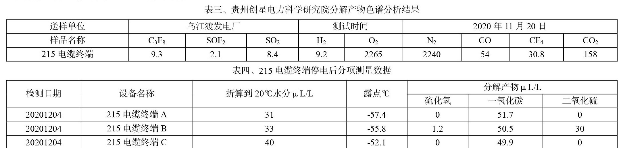 2020年11月17日,贵州创星电力科学研究院自带设备到现场对215电缆终端隔室进行分解产物测试,显示SO2含量为16.8μL/L,与乌江渡发电厂测量值17.6μL/L基本相符,排除了检测设备、人员操作原因存在较大误差因素。同时取样进行分解产物色谱分析。分析结果见表三。并由贵州创星电力科学研究院进行GIS局放检测,未见明显放电现象。经过数据分析,结合DL/T 1359《六氟化硫电气设备缺陷气体分析和判断方法》进行判断,认为SO2超标情况呈明显增大趋势,需对215电缆终端隔室与#5主变高压侧电缆终端三项停电检查处理。12月4日停电后,分项测试分解产物,结果见表四。