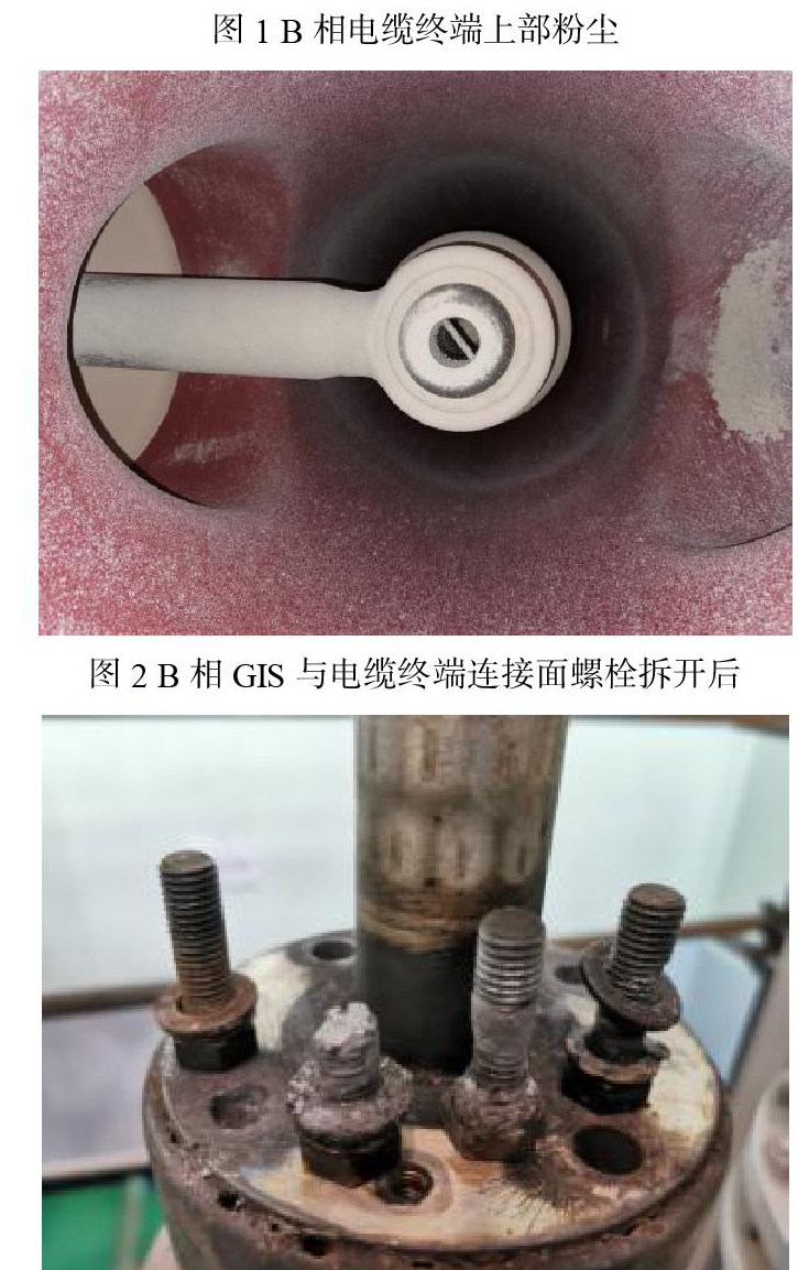 对B相电缆终端气室解体发现有大量乳白色粉尘(见图1),气室内各导体镀银的裸露部位表面发黑,GIS主导体(铝材镀银)与电缆终端上端头接触面局部熔化,接触面压紧螺丝局部烧损(见图2),B相电缆终端上端头导体与电缆线芯的连接面完好无损。绝缘套管底部有疑似高温飞溅物损伤和对筒体底部内壁放电痕迹,连接板均压环对周围筒体内壁有放电麻点;A、C相电缆终端气室内未见异常。
