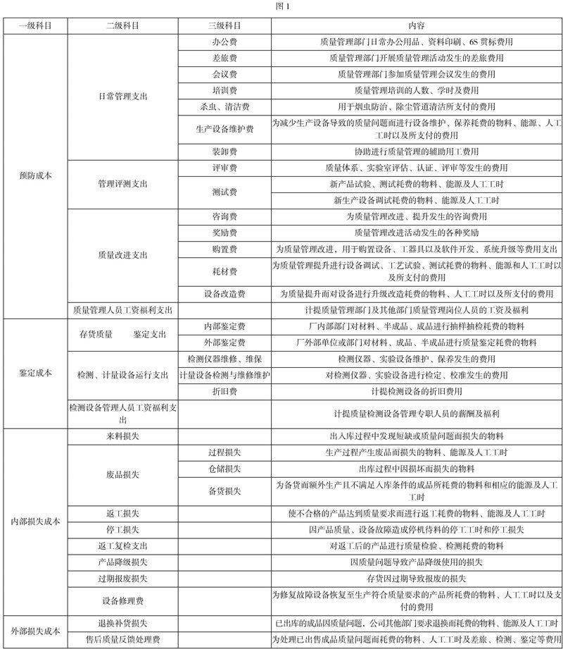 质量成本属于企业生产总成本范畴,但又不同于财务会计核算的生产成本。经查阅研究资料发现,国内外学者对质量成本提出了很多种不同的看法,其中以《全面质量控制》的作者费根堡姆以及美国质量管理专家朱兰提出的概念最具代表性,即企业为了保证和提高产品或服务质量而付出的一切成本费用,以及因未达到产品质量标准造成的损失都应确认为质量成本,一般按预防成本、鉴定成本、内部损失成本、外部损失成本进行分类。