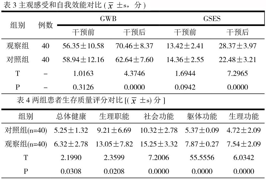 组间患者的主观感受和自我效能对比,差异有统计学意义(P<0.05),见下表。