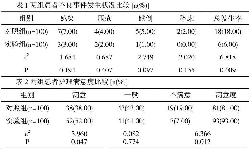详细记录两组患者的不良事件发生状况、护理满意度,并进行组间比较。①不良事件包含:感染、压疮、跌倒、坠床等;②护理满意度[4]:应用“问卷网”生成满意度调查表的二维码,由患者使用手机进行填写。满意度调查表共采取百分制,分为三项指标,即满意(≥85分)、一般(70~84分)、不满意(<70分)。